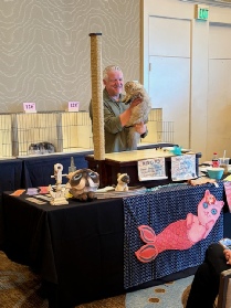 Claude’s tolerance with other cats is slowly getting better. We either walked around among them, or he stayed on the benching table, where people could get to know him better. Our next show is in Brighton, CO (Denver), on the weekend of February 4-