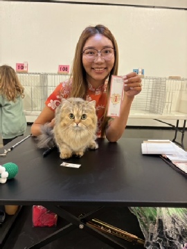 Weirdly enough, Cosette is the one I am really proud to show because she was from my breeding. I raised her from birth and she is my current heart cat. She makes me smile every time I see her and she is truly my joy. That’s why I proudly present her in rings, but then I am heartbroken, after watching her play with the judge, for her to get last, or second to last place. I just can’t understand how judges assume she is sickly when she plays so excitedly. And she sits attentively while she is waiting to be judged. This is one of the few times in my decade of show cats that I have been brought to tears.